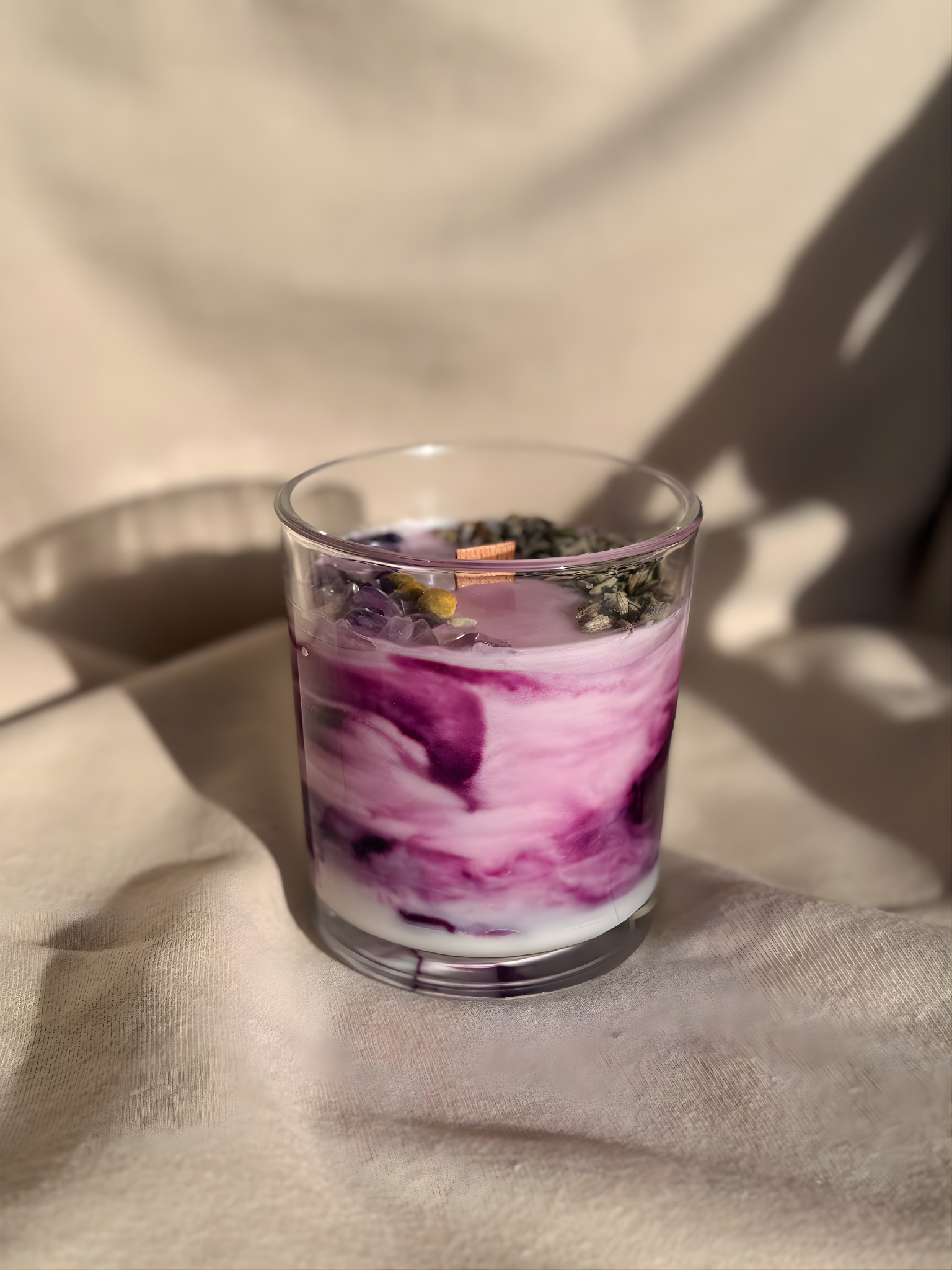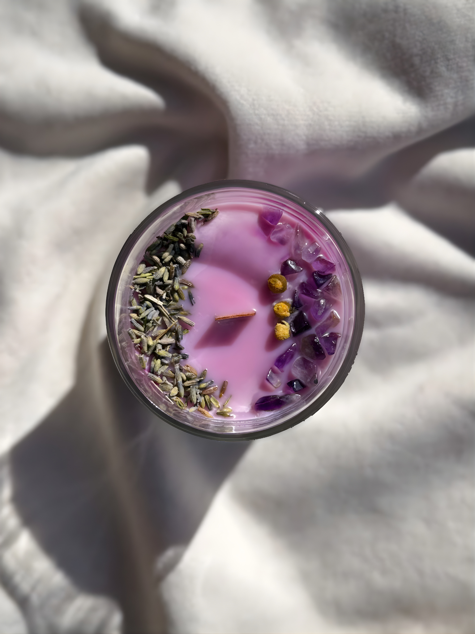 Cada vela está decorada a mano con lavandin, manzanilla, amatista y cuarzo, símbolos naturales de protección, serenidad y sanación emocional.