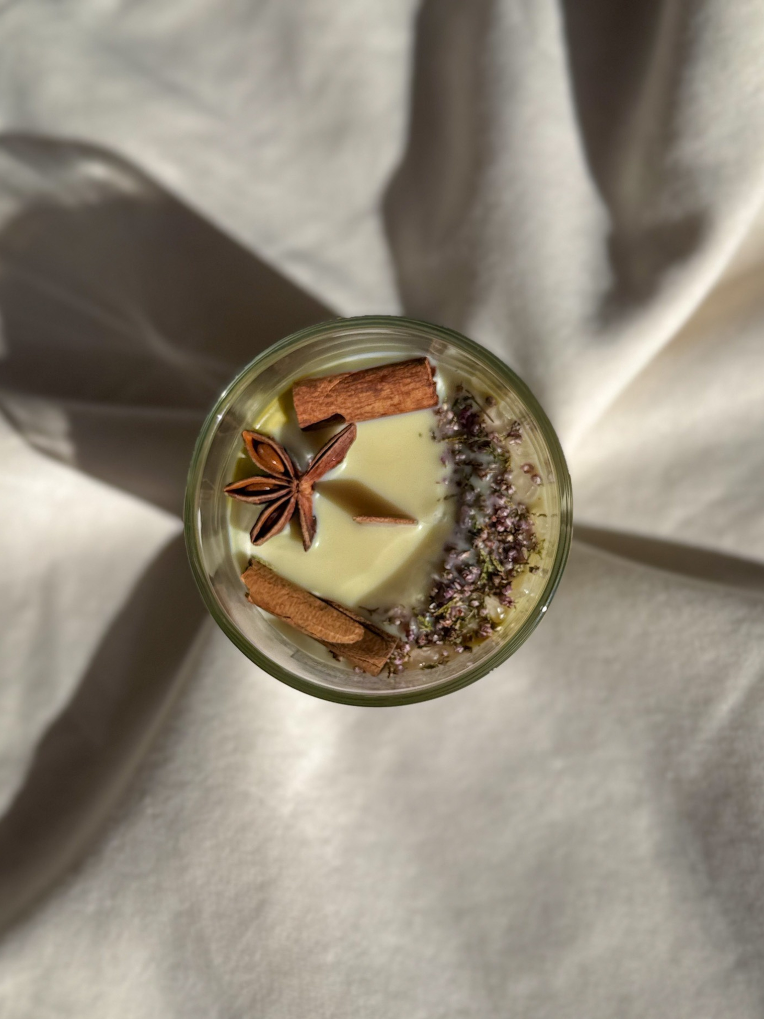 Cada vela se decora a mano con canela en rama, flor de brezo y anís estrellado, símbolos naturales de protección y armonía.