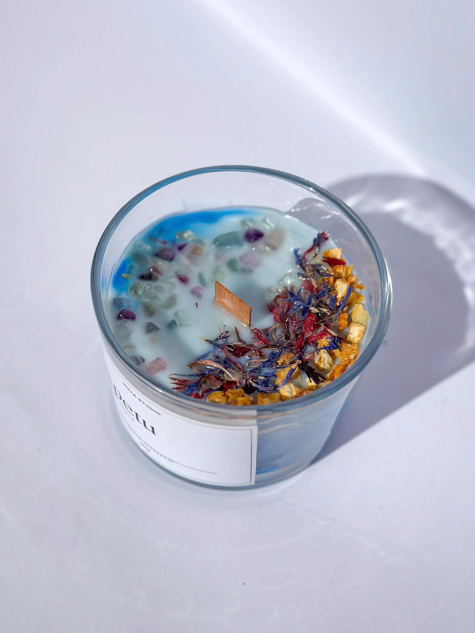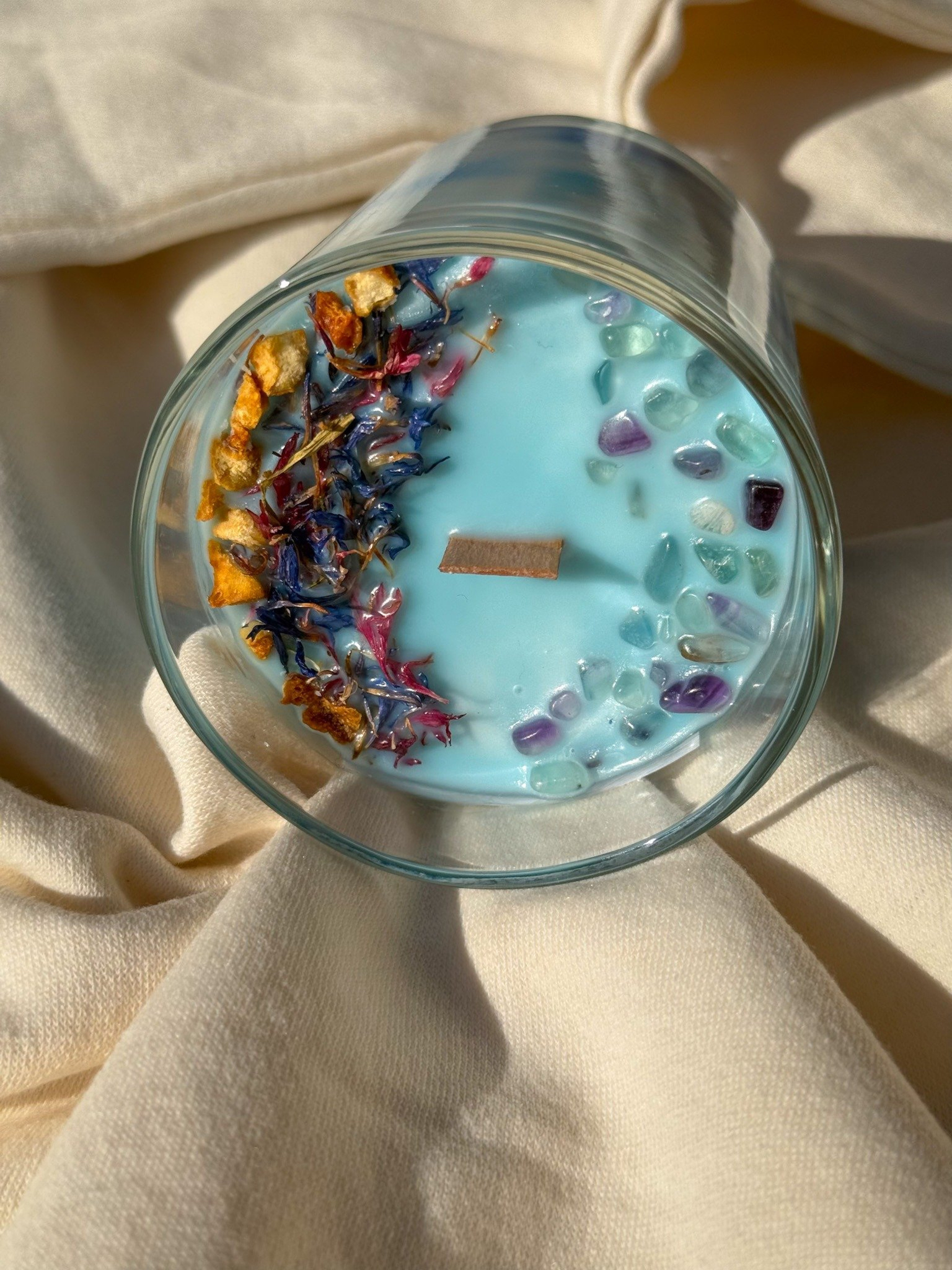 Cada vela está decorada a mano con citrino, la piedra de la vitalidad y la abundancia, acompañada de corteza de naranja, jazmín y pétalos de aciano rosa, símbolos naturales de alegría y creatividad.
